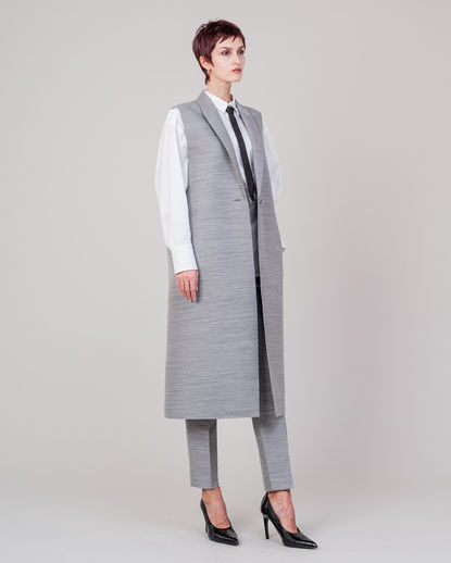 This long tuxedo vest is well-known for its silky luster and color, and wool's firmness. The collar is made of colored cloth on the inside, giving it a gentle barrel silhouette in a genuine men's tailoring style. It has a three-dimensional shape that gives it a wrapped-in feel. It has the same covered button details as the tuxedo jacket, and it has an overwhelming presence even when worn lightly.