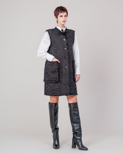 Beautiful waffle-woven tweed from British company LINTON, inspired by the Hanging Gardens of Babylon, one of the Seven Wonders of the World. The black base fabric is rich in texture, and the contrast between the luxurious sparkling sequins and lurex expresses beautiful plants in the darkness. A fresh and balanced half-length vest that can also be worn as a mini dress. All parts are double-fringed with a different grain and loosened by hand. The original black metal buttons are a subtle accent. Not only can it be worn as a vest or a dress, but it can also be worn coolly by mixing and matching it with a shirt with a tie.