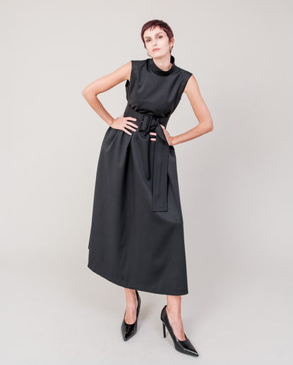 Wool twill with a beautiful luster unique to high-quality natural materials from REDA, an Italian company. A long-established worsted wool manufacturer with 150 years of history, it is the first in the world to be certified as a B Corporation (B-Corp). It is a reliable manufacturer with responsible, sustainable and transparent consistent management. A long dress with a sleeveless tent-line silhouette that sways gracefully with minimal cutting so as not to damage the beautiful luster. The tuck on the back shoulder enhances the silhouette. The thick belt made of the same fabric is an accent that is popular this season, and you can arrange how you wear it.