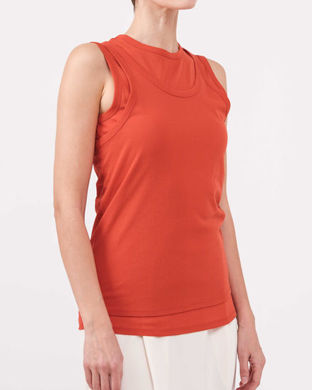 Sunlit orange layered tank paired with light white bottoms. The clean finish and subtle sheerness soften the bold color, resulting in a relaxed mode style that shines in summer light.