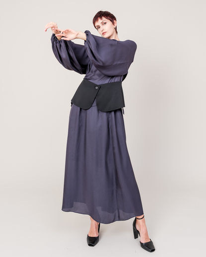ベース素材は国内生産で、バイオマスマークの認定を受けたトリアセテートとポリエステルのジョーゼット。細番手で柔らかく、繊細なドレープ性を活かして、ボリュームのあるパフスリーブに。背中からウエストに回るパーツは、イタリアREDA社の上質な天然素材ならではの美しい光沢を放つウールツイル。ブラックの配色にすることで、まるで変型ベストを着ているようなデザインのブラウスです。同素材のロングスカートと合わせると、ウエストパーツがアクセントとなって引き締まります。