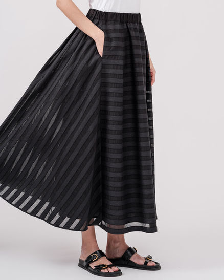 シアーストライプのショートベストとタックギャザースカートをセットアップで合わせた、軽やかでマニッシュなスタイリング縦・横・斜めに流れるストライプが重なり合い、視覚的なリズムと奥行きを生み出します。インナーにはノースリーブトップを合わせ、静けさの中に確かな存在感を宿すサマールックに。