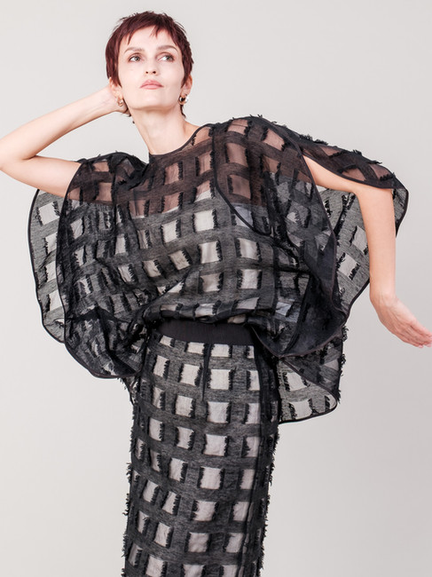 この時発表したサテンドレスは、まさに「素材が語る」ブラックドレスです。 身体を拘束しない流れるようなシルエットと、深く濡れたような光沢。装飾を一切排し、生地の「落ち感」と「ドレープ」だけで成立させる。静止している時よりも、歩き出した瞬間にその真価を発揮するこの一着に、DOMELLEのフォーマル哲学の全てが凝縮されています。